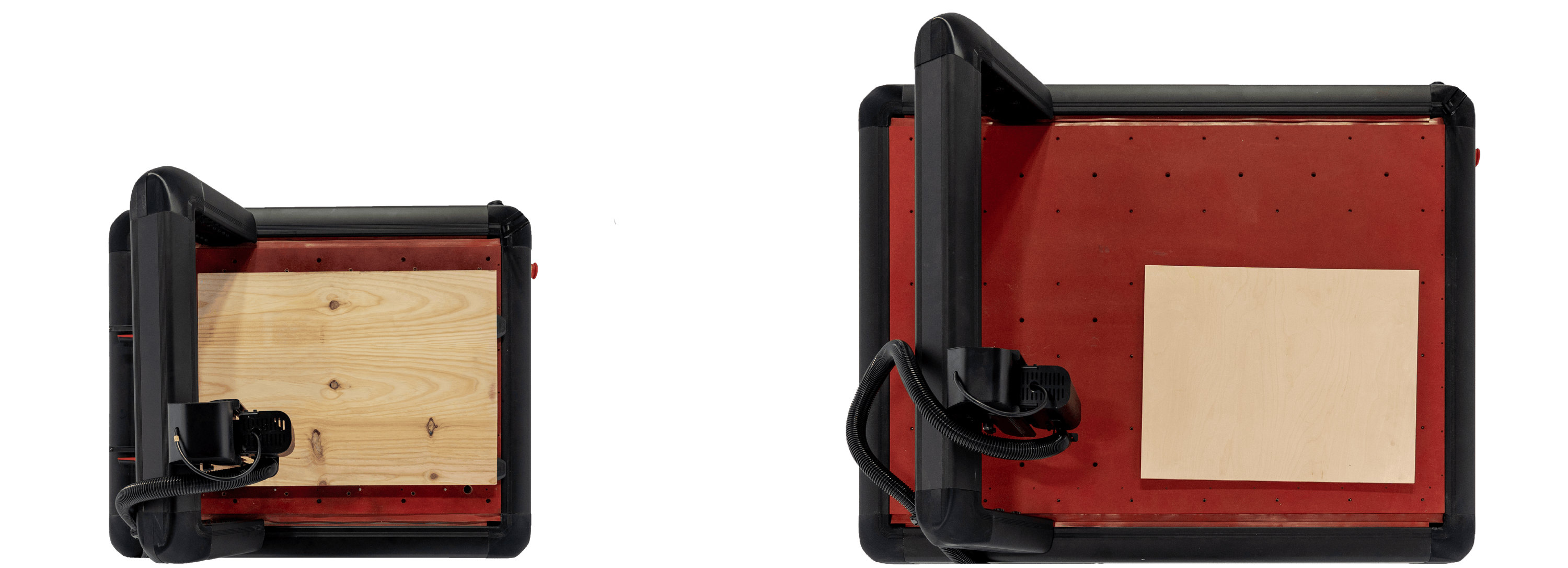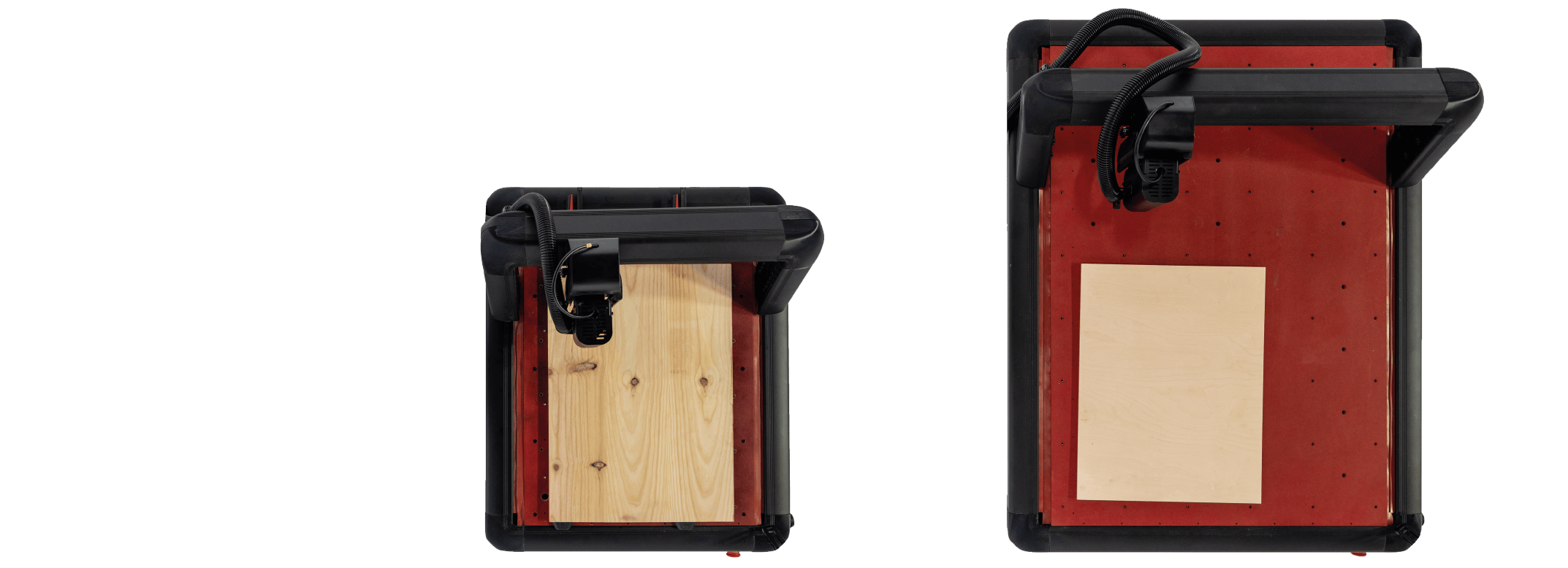 Model S (700x500 mm) or Model M (1.100x750 mm). Pick the one that fits your fabrication needs, workshop space, and budget. Both models are engineered to be lightweight without sacrificing sturdiness, thanks to their structures of aluminium extrusions.